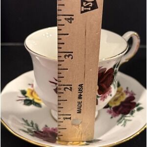 Queen Anne England Red Yellow Rose Gold Rimmed Footed Tea Cup Saucer Vintage
