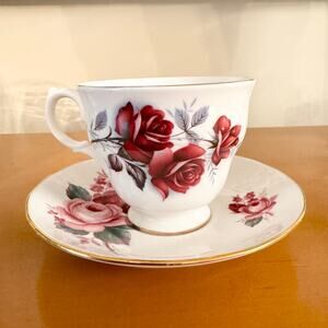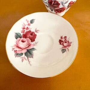 Queen Anne pink and red roses gold trimmed vintage bone china tea cup and saucer. Marked D679, Made in England. Excellent condition. Teacup measures approx. 2 3/4" tall and 4 1/4" wide including handle, saucer measures approx. 5.5" wide.