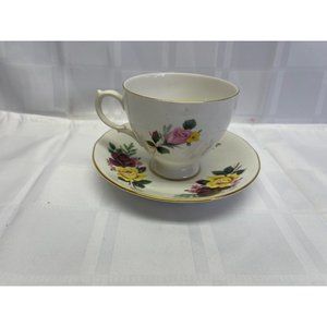 Queen Anne Teacup Saucer Set Vintage Bone China England Deep Red Yellow floral