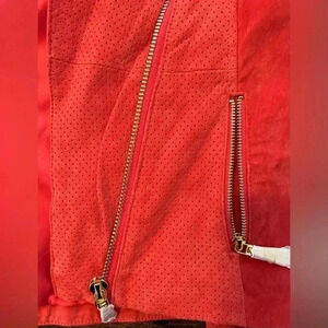 Queen Collection | apricot suede moto style womens jacket. Size: M. 100% pinhole suede. Color: apricot. Long sleeves, 24”. Length: 24”. PIT2PIT: 19”. Gold hardware, zippers & pulls (pulls are still covered in tissue). Jacket is beautiful! Brand new, never worn. NWOT.