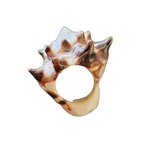 This large brown and white Queen Conch shell ring from the Bahamas is in very good condition and measures about 1.75 inches across the front. It is size 9.75. Be sure to look at all photos for a complete description.