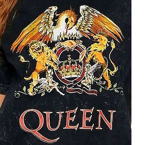 Super comfy mineral wash black cotton T-shirt featuring a classic logo design from the classic rock legends Queen on front. Crew neckline, short cap sleeves, and a fitted construction. Must have for every Queen fan. 100% Cotton.