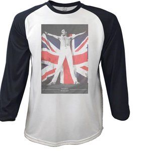 3/4 sleeve Raglan Baseball style T-shirt with Freddie Mercury posing with a large Union Jack flag. Slightly round hem line. 100% great quality cotton,comfortable and stylish, made in UK.