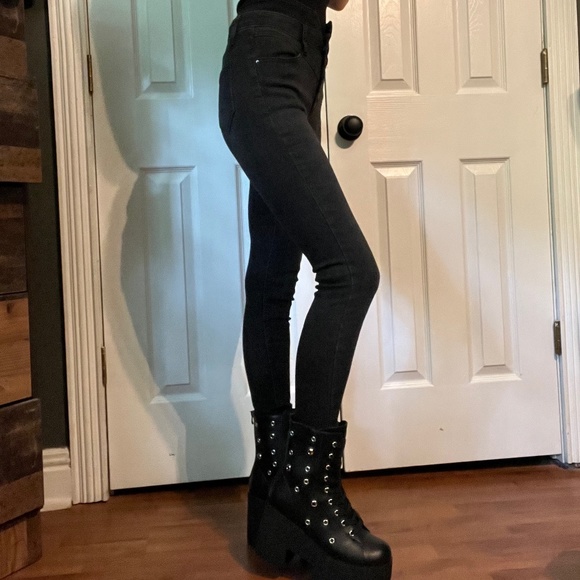 Never worn, just tried on. High waisted black jeans with corset style top. Closes with zipper and buttons. Size EU small, but fits a US XS. Brand is Queen Hearts Paris