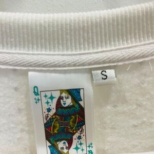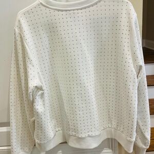 It features sequin and rhinestone accents on a white cotton/polyester material with fleece lining.