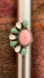 This exquisite Southwestern-style half-cluster ring features a prominent oval Queen Pink Conch shell (measuring .65”L x .44”W) at its center, surrounded by a vibrant array of Kingman Turquoise and lustrous Mother of Pearl (MOP) stones, arranged in a visually appealing cluster design. Crafted from genuine 925 sterling silver, the ring showcases intricate silverwork, including a twisted rope border around the central conch stone, and is designed with an adjustable band for a versatile fit, typically accommodating sizes 6-10. (It is currently set at size 8.75). The combination of the soft pink conch, the striking Kingman Turquoise, and the iridescent MOP (Mother of Pearl) creates a harmonious and distinctly Native American-inspired piece, reflecting skilled artistry and traditional craftsmanship.