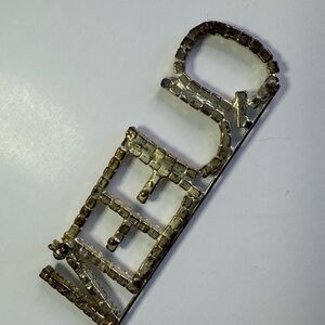Definitely a statement piece—this "QUEEN" rhinestone script pin was crafted by a local artist. This is a large, high-shine piece perfect for adding some "bling" to your favorite accessories.