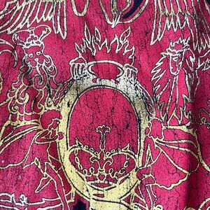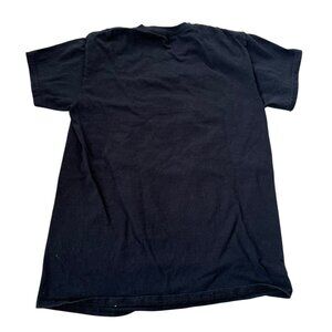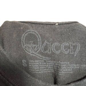 Queen t shirt, black with red and yellow crest logo, adult small, pit to pit: 17", length: 25", preowned and shows visible wear/cracking on the graphic print - see photos