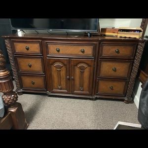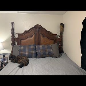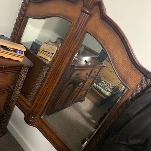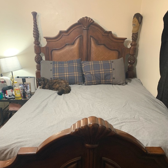 Make me your best offer! Grandmothers Solid wood queen bed set. Comes with frame, head and foot board, dresser, mirror, mattress and box spring!
