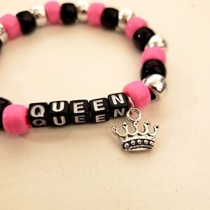 "Queen" kandi word bracelet made with pony beads, black letter beads, and silver crown charm. Bracelet is 30 beads around and made with elastic string to adjust to any size wrist.