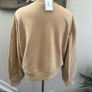 Chic beige sweatshirt with eye-catching turquoise beaded necklace detail. Ideal for a trendy casual outfit. Slightly shorter length. Super soft and cozy Inside. Hand wash. New with boutique tags!