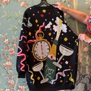 BRAND NEW. Black oversized knit New Year’s Eve sweater dress, embellished with pearls, metallic ribbons, and rhinestones. Pattern includes a clock, champagne bottle and clinking glasses. Never been worn, NWT