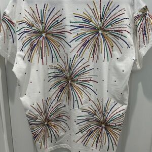 Small Queen of sparkle, white mega firework Tee. Sizing is very generous depending on how fitted you like your tees. . Cotton./spandex