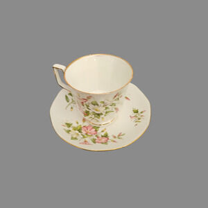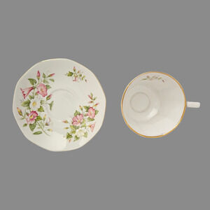 Elegant vintage Queen’s fine bone china teacup and saucer set made in England by Rosina China Co. Ltd. Features a charming floral design with pink and white blossoms accented by green leaves and finished with a gold trim. Octagonal saucer and cup with angled handle add a distinctive touch.