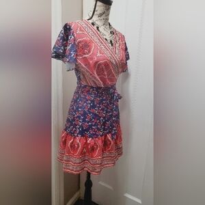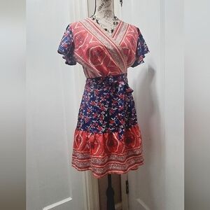Queens Floral Colorful Wrap Front Dress For Women. It's a wrap short dress. coral red n blue color Length 34"
