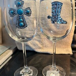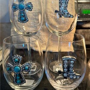 The Queens’ Jewels Turquoise Cross Stemless and Stemmed Wine Glasses & The Queens’ Jewels Cowboy Boot Jeweled Stemless and Stemmed Wine Glasses. I have 4 of these beautiful wine glasses. They were a gift several years ago but I just unboxed them about a week ago and put the. On a shelf.