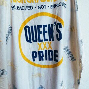 Large 100-pound size Queen's Pride old Flour Sack with stains/rust. Obtained used - Not washed. Otherwise in good condition. Cute open to lay flat.