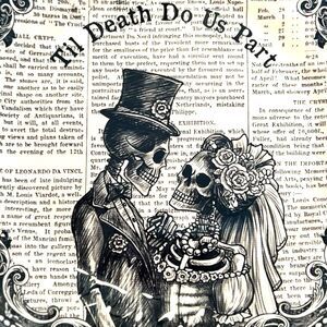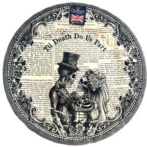 Add a spooky touch to your dinner table with this set of four porcelain dinner plates from Queen's. Featuring a Til Death Do Us Part Skeleton Couple pattern in black and white, these round plates are perfect for Halloween or as part of a Gothic decor style . The plates are microwave and dishwasher safe, making them convenient for everyday use.