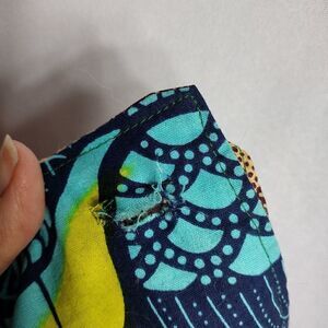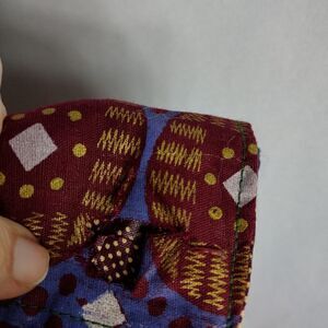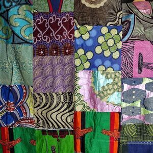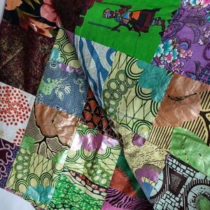 60x80" hand crafted bed spread, there are two holes on the corners of one end, possibly from being used as a wall hanging. front is patch work squares, back is purple swirls, all same material