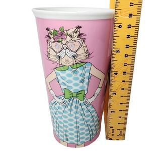 Excellent, used condition. Pink and white ceramic coffee mug depicts a cat head/woman body fashionista. Please see pics for details and measurements. No chips, cracks, or stains noted. Smoke-free, ask any questions. Shop my closet for more great items: BUNDLE, BUNDLE, BUNDLE for discounts!!!