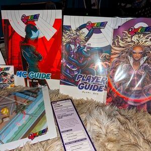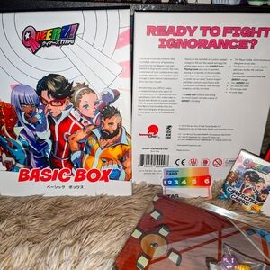 Queerz! Basic Box contains a Player's Guide, MC Guide, 5 Character Folios, and 2 Queerz! Dice!