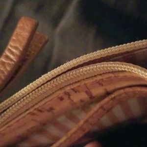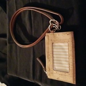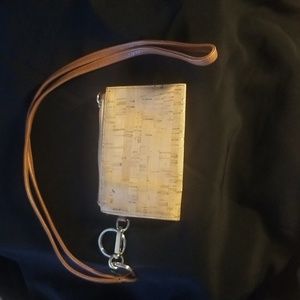 Queork vegan cork wallet made from Portuguese cork. Tan cork with gold flecks. One outside pocket for ID . zipper closure with long strap.