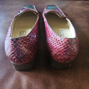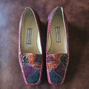This pair of gently worn Quercioli Firenze colorful snakeskin loafers is striking due to the color palette. The burgundy, green and brown patterned sections on the toe section are lovely. They are a European size 36 or US size 5.5 with leather soles and a 1.5-inch block style heel. There is some sign of wear on the soles, but the heel and upper part of the shoes look almost like new. Shoes were purchased in Italy while on vacation.