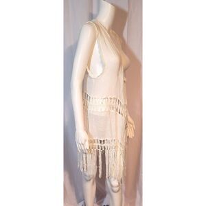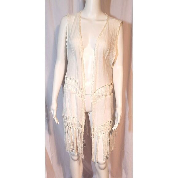Excellent, used condition, Open front vest with fringed hem. Trimmed around neckline and arms with the same crochet.