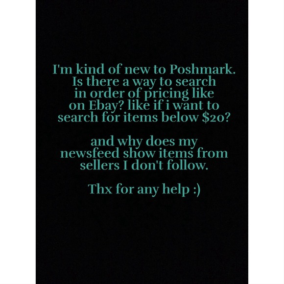 @seciaklocke @beckytf There is a way to narrow by price. You search for what you're looking for then if you scroll to the right where it later you narrow by size, category, etc., you'll see price. You can click on that and select your price range. Most people don't know it's there since you have to scroll to the right, at the top, to see it. Also, on your news feed you will see people you're following and anything they share from other people's closets.