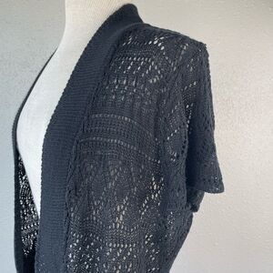 Classic loose knit cardigan style sweater measuring 18 inches armpit to armpit laying flat and 21 inches in length from shoulder to hem.