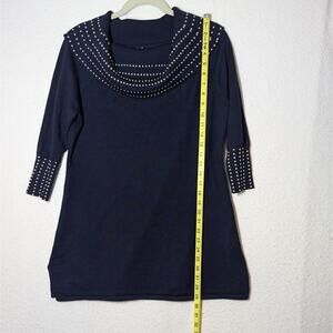 Questions Women's Sweater Size XL Navy Blue Studded Neck & Cuffs Nautical Style Tunic Top.