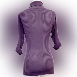 I’ve got this super stylish ribbed knit sweater with buttoned sleeves that’s perfect for a chic look. I haven’t worn it more than twice. The front picture is with the regular light on, and the back picture is with my light off. You can see how pretty the color is. Sorry for the wrinkles, it’s been in my closet.