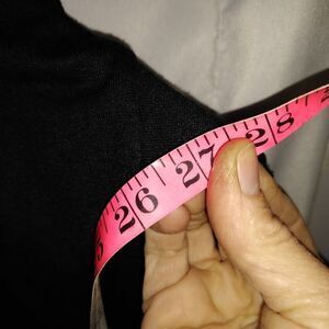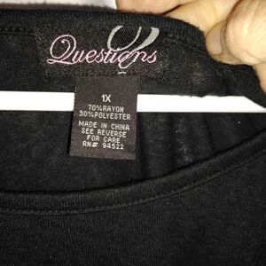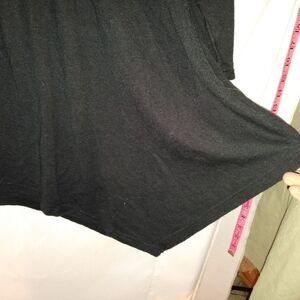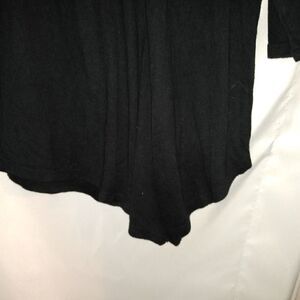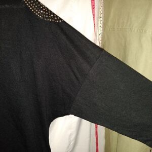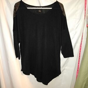 Black, rayon polyester blend, asymmetrical tunic with gold studded shoulders.  Drop sleeves.  Chest 27". T