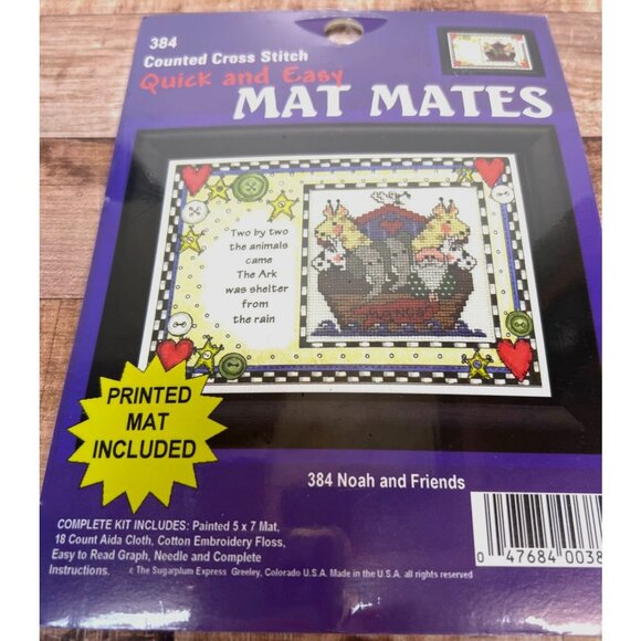 Comprehensive cross-stitch kit featuring a charming Noah's Ark themed design, offering crafters a delightful project with pre-printed mat and essential materials for creating a whimsical needlework piece.