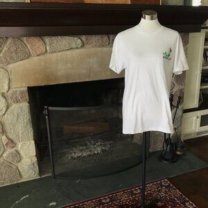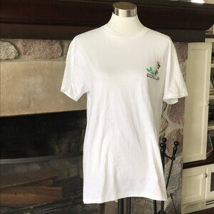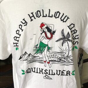 This item is a regular fit white T-shirt with "Happy Hollow Days" Christmas Hula Dancer Logo on full back and small one on the front. The shirt is longer than typical cotton tees.