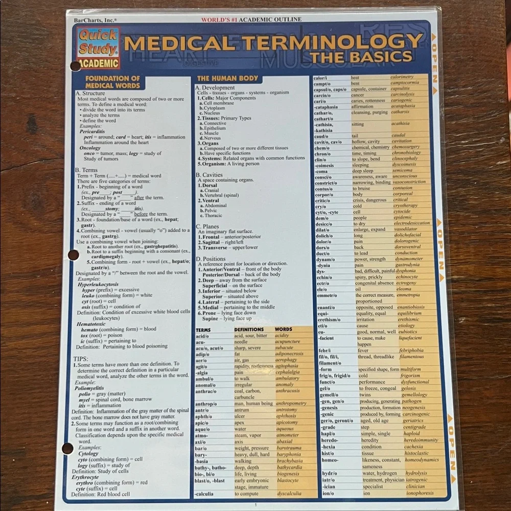 Quick Study Medical Terminology Guide Has 3 Ring Holes For a Binder