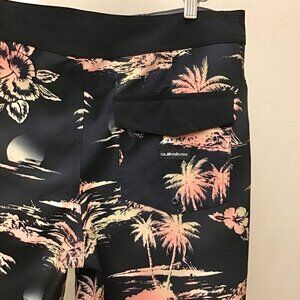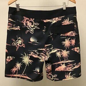 Quicksilver Size 34 Highline Board shorts, Stretch, Black, Tropical, Men’s, Swim, Surf. Preowned. Nice condition. No stains or flaws.