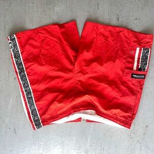 Bold red Diesel shorts with stylish side stripes. Ideal for sports and casual wear. Comfortable and trendy design.