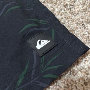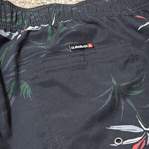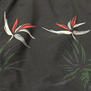 Stylish black swim shorts featuring a vibrant floral design. Perfect for a day at the beach or pool.