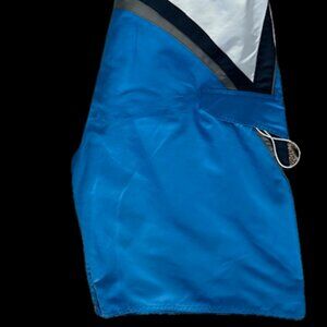 These board shorts are gently used and come in a solid blue with silver and black accents. Have a drawstring closure, polyester lining, and a side pocket