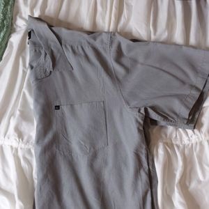 Size XL, short sleeve grey with small white lines. Good condition, missing 1 top button (pictured). Very soft fabric