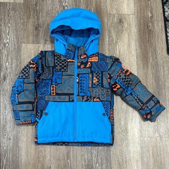 Vibrant jacket with geometric patterns. Features a bright blue hood and accents. Perfect for adding a pop of color.