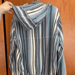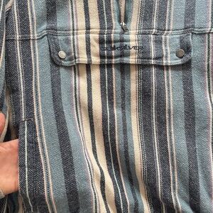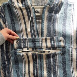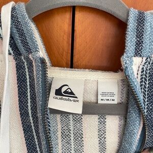 This is a striped quicksilver hoodie labeled a size medium. Fits a little oversized. 100% cotton with a hood, side pockets, and a large zipper pocket with snaps in the front to store things on the go. Really nice layer to throw on when it gets cold at night or windy on a beach! NWOT!