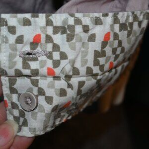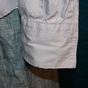 Lilac button down blouse with a floral print on the front and back. The cuffs have a colorful pattern that can be styled in multiple ways.