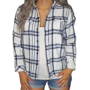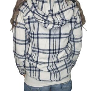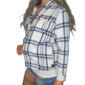 Good condition cute white and navy blue flannel hooded button up by Quicksilver in a kids XL / 20, or can fit an adult womens small or XS as shown in photos. No rips stains or tears, the fabric does have some fuzzies due to the nature of flannel fabrics primarily coming from the dark blue, nothing major but just wanted to point out. Shown up close in photos.