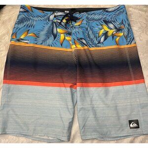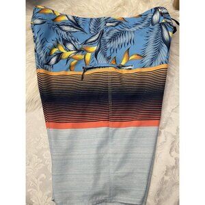 Quicksilver Men’s Size 38 Blue Orange Hawaiian Floral Striped Board Shorts Swim