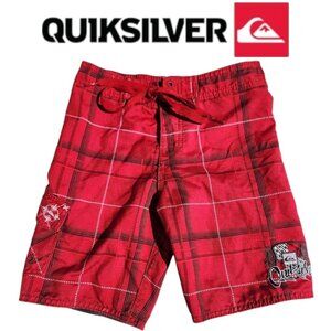 Quicksilver Swim Trunks Size Small S Boy's Swimming Shorts Red Plaid Swimsuit