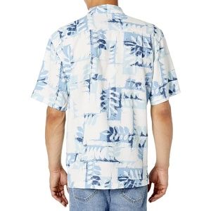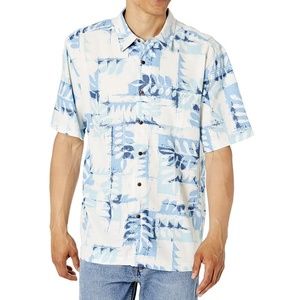 Quicksilver Waterman Collection Men’s Canoes Reef Short Sleeve Button Front Shirt. Style #AQMWT03468. Color: White, navy blue, medium blue and light blue geometric and leaf all-over print. Soft, flowy TENCEL woven fabric. Comfort fit. Short sleeves. Point collar. One chest patch pocket. Straight hem with side vents. Pleated back yoke. 87% modal, 13% polyester woven fabric. Machine wash cold. Tumble dry or line dry.