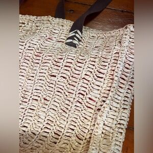 A great summer carryall. Lining is perfect. Outside is clean and in good condition. Looks like straw but is likely not a natural fiber. Straps are leather. Great tote or shoulder bag. Perfect for all you need to carry.