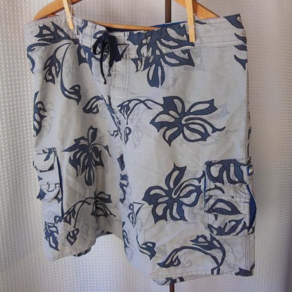 Quicksilver vintage board shorts, 2 pockets grey tropical flowers 36 tie front